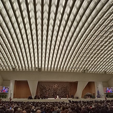 Nach dem Security-Check nahmen wir im hinteren Drittel des Auditoriums Platz. Hinter dem Papstsessel beeindruckte die monumentale Skulptur La Resurrezione von Pericle Fazzini: Jesus, der aus einem durch eine nukleare Explosion aufgerissenen Krater aufersteht. Diese ungewöhnliche Darstellung, ein metaphorischer Kreuzersatz, war irritierend, faszinierend und blieb besonders im Gedächtnis.