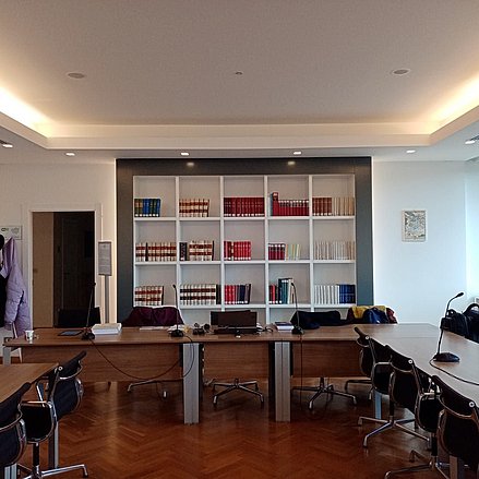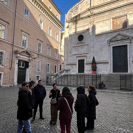 Umso schöner war der Gang hinaus in die Sonne Roms und ein Gespräch bei Kaffee und Snack. Nach einer gemeinsamen Reflexion im Park nutzten wir die Umgebung für einen Spaziergang, bevor es, wieder mit Koffeinbedarf, zum Deutschen Historischen Institut (DHI) ging. Dort wurden wir herzlich empfangen und konnten uns intensiv über unser Forschungsprojekt sowie die Arbeit des Instituts austauschen. Das DHI, gefördert von der Max-Weber-Stiftung, forscht interdisziplinär auf internationalem Niveau. Wir lernten unter anderem PD Dr. Vera Grund, Prof. Dr. Petra Terhoeven sowie Dr. Eleonora Di Cintio und Dr. Elisa Novara kennen, die ihre Projekte vorstellten, darunter „Tanz/Musik Digital“ und „Transnationale Kompositionsmethoden des 19. Jahrhunderts – die ‚Schule‘ von Salieri“. Prof. Dr. Sabine Meine, die früher am Institut tätig war, stellte unser Projekt vor.